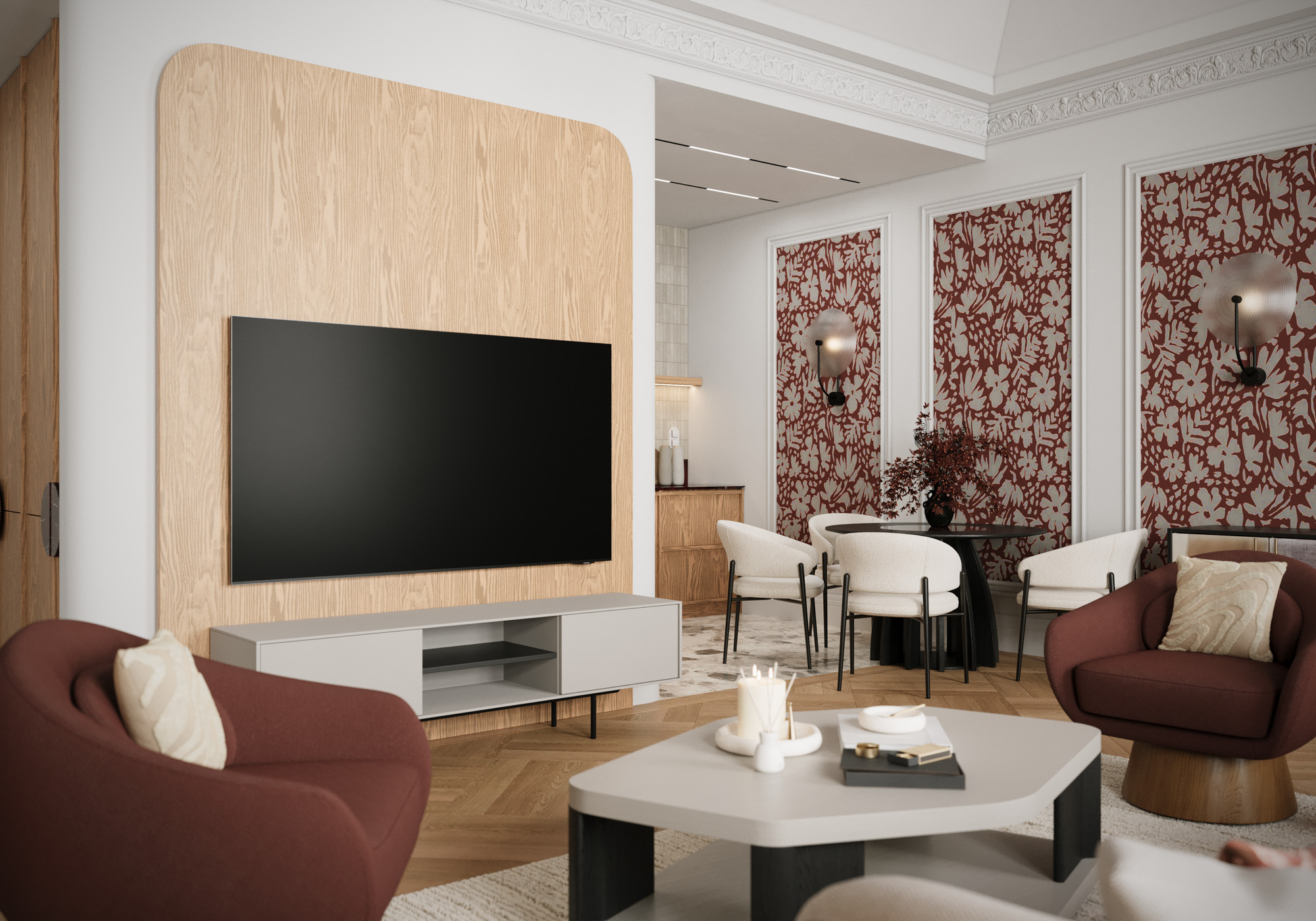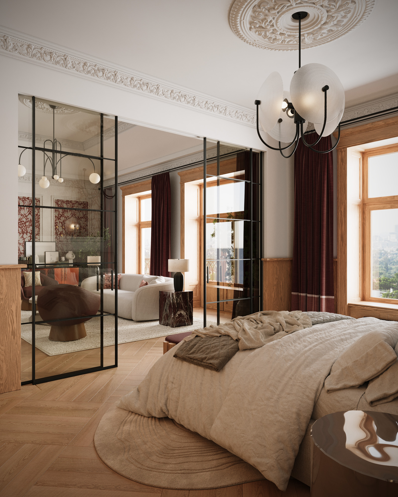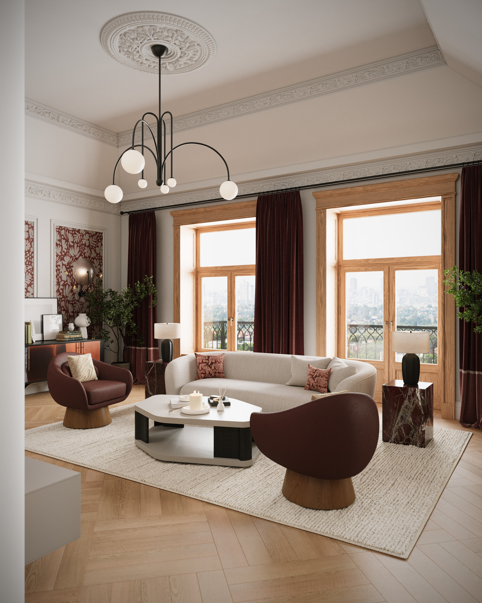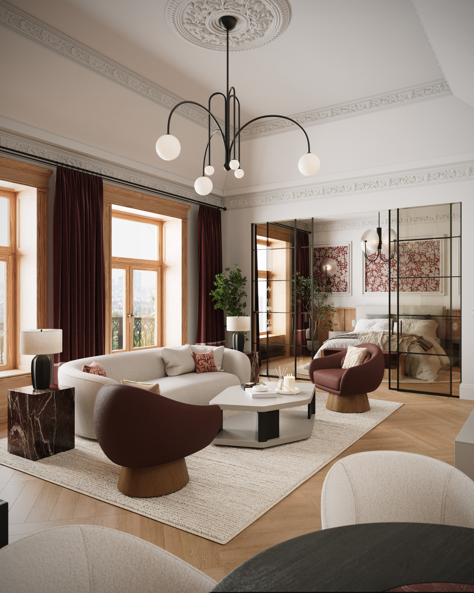 Projekt utrzymany jest w stylistyce nowoczesnej klasyki z subtelnym, dekoracyjnym akcentem. Klasyczne sztukaterie, wysokie okna i elegancka symetria zestawiono z miękkimi, obłymi formami mebli oraz wyrazistym oświetleniem. Ciepła paleta beży, burgundu i naturalnego drewna buduje przytulny, a jednocześnie wyrafinowany charakter wnętrza.