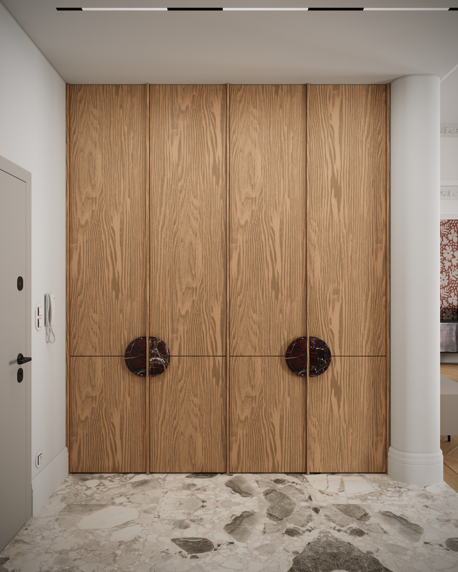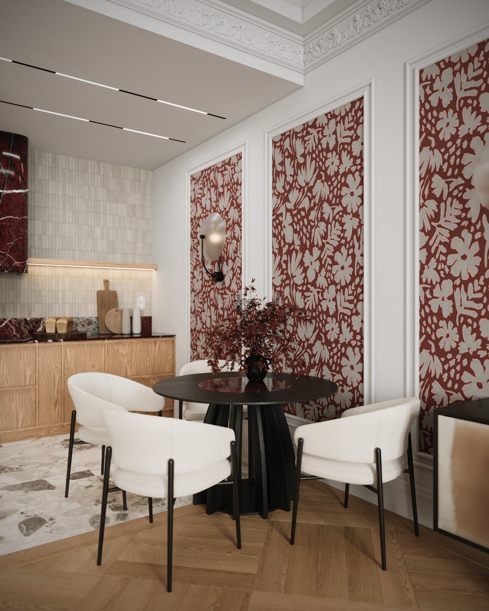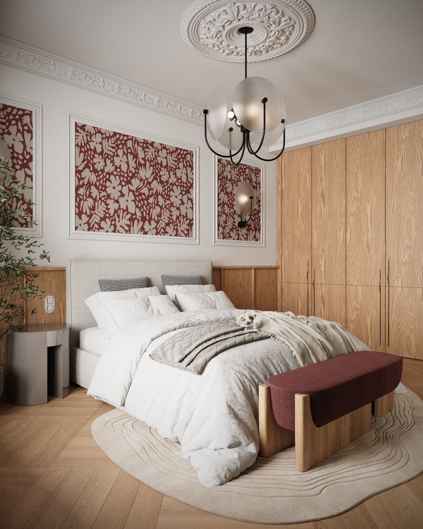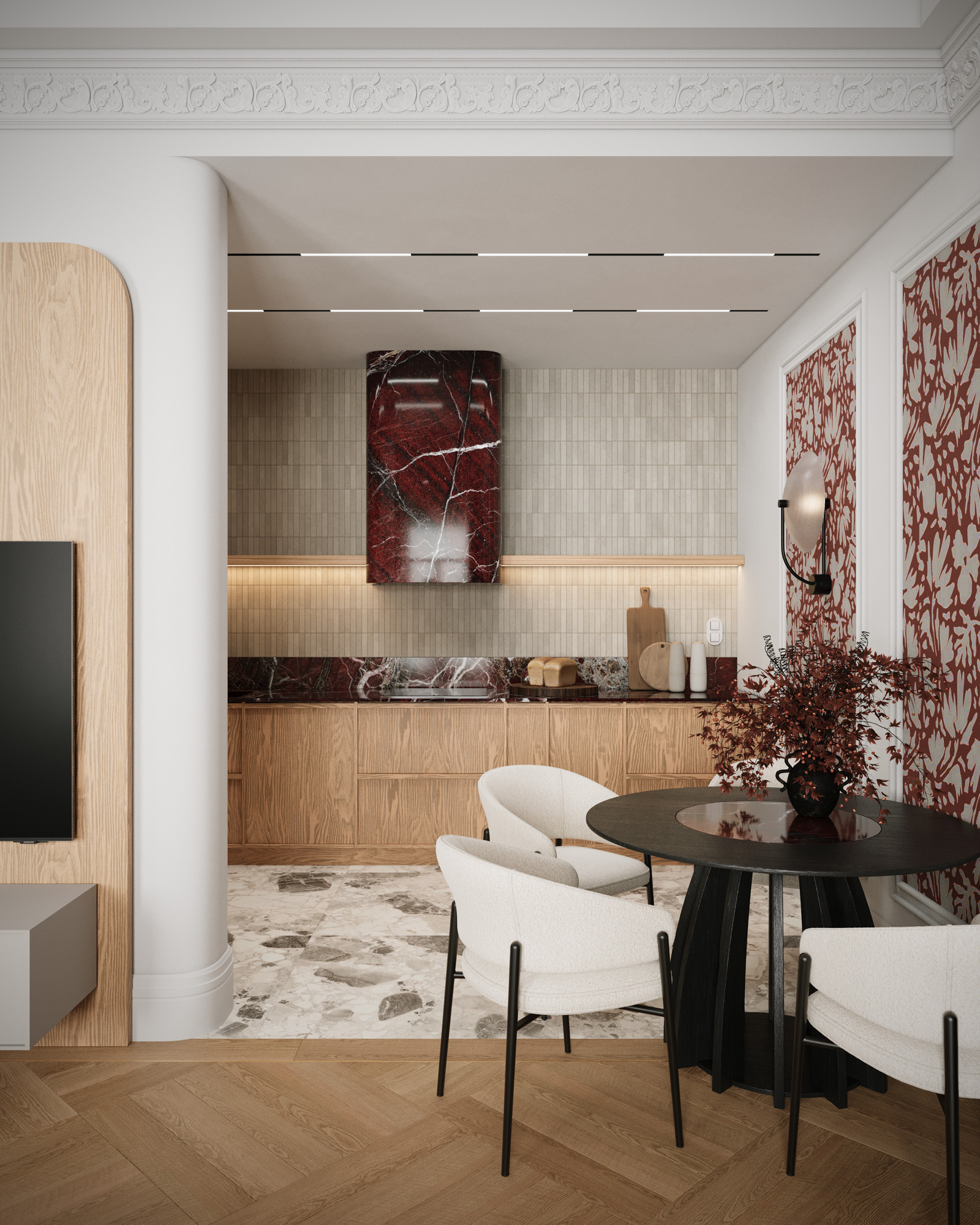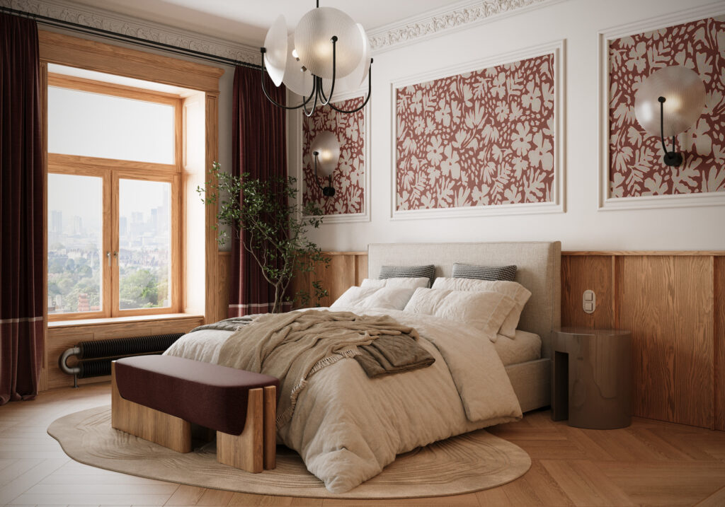 Projekt utrzymany jest w stylistyce nowoczesnej klasyki z subtelnym, dekoracyjnym akcentem. Klasyczne sztukaterie, wysokie okna i elegancka symetria zestawiono z miękkimi, obłymi formami mebli oraz wyrazistym oświetleniem. Ciepła paleta beży, burgundu i naturalnego drewna buduje przytulny, a jednocześnie wyrafinowany charakter wnętrza.