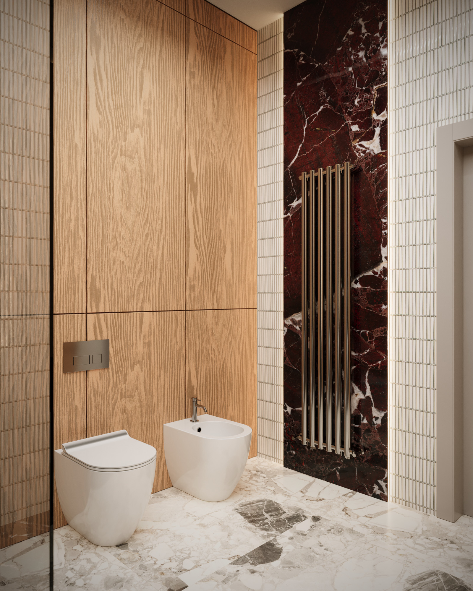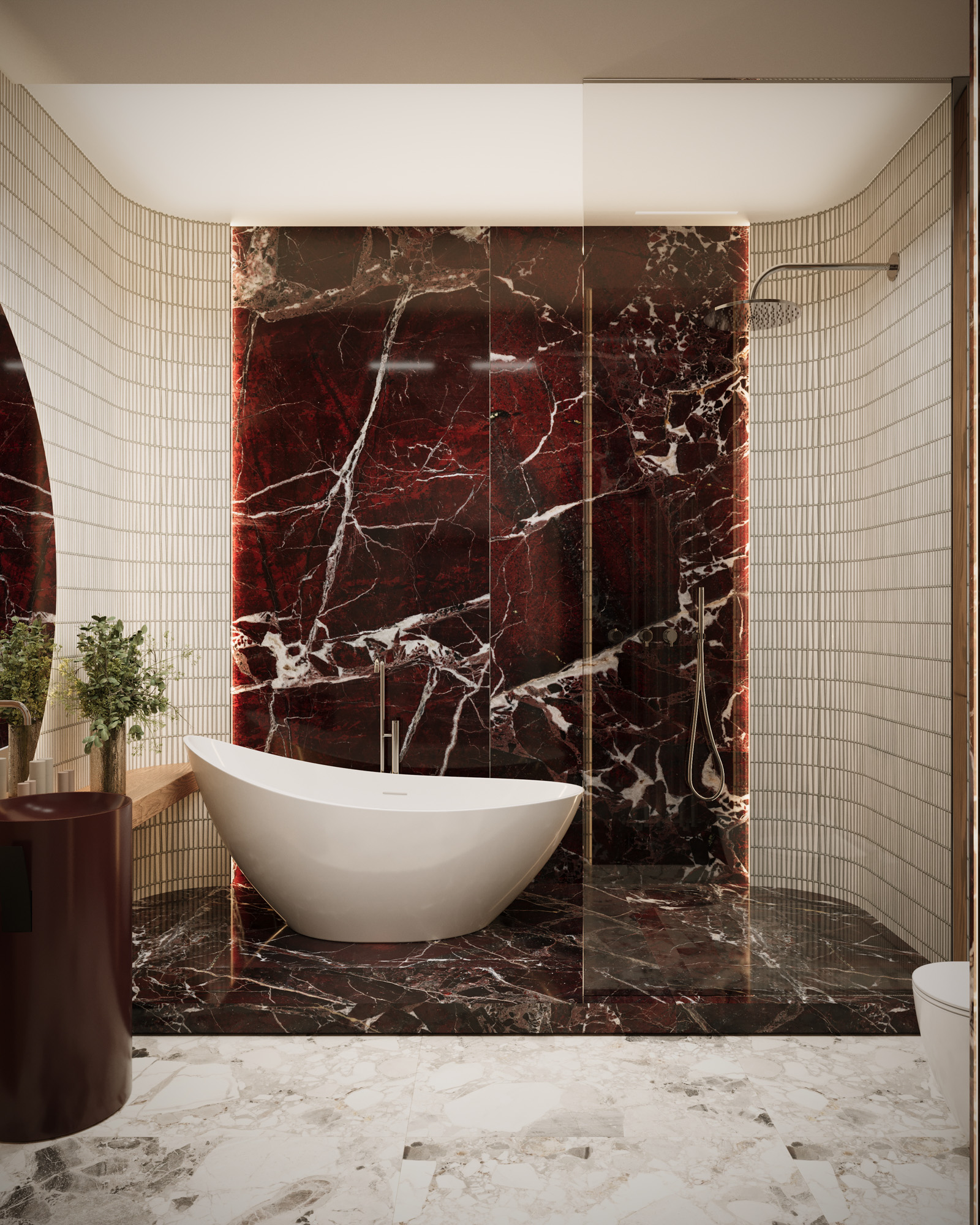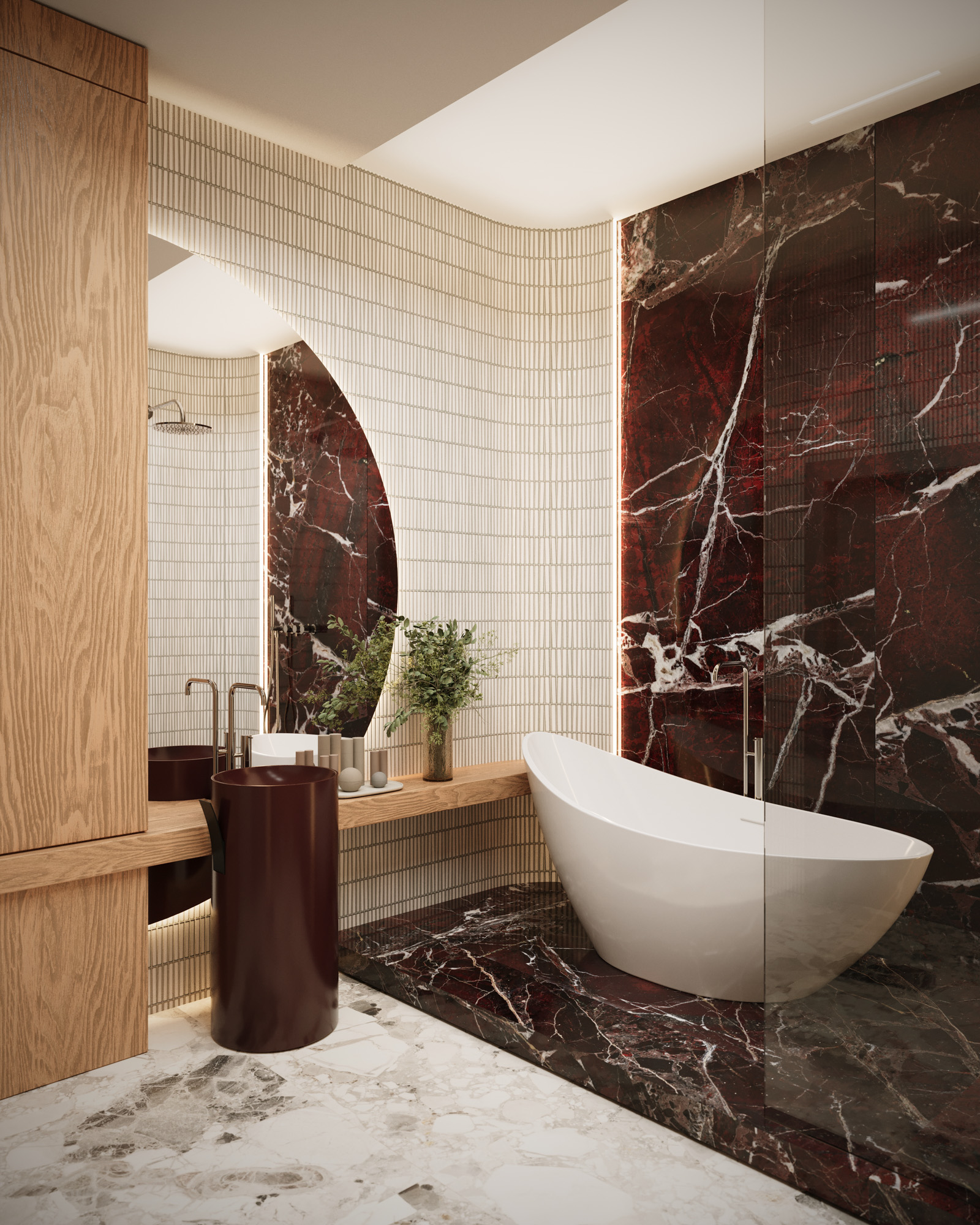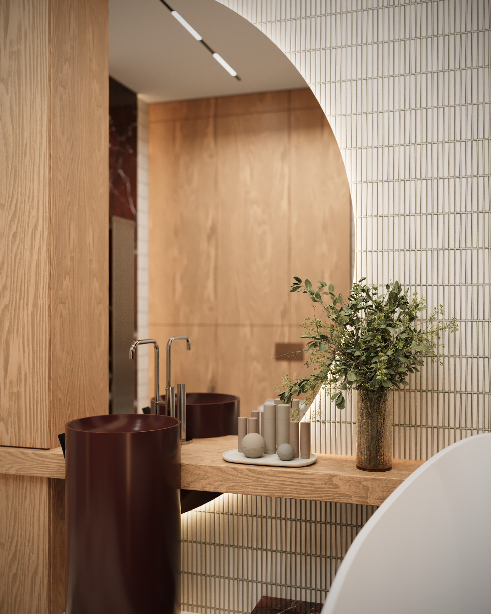 Projekt utrzymany jest w stylistyce nowoczesnej klasyki z subtelnym, dekoracyjnym akcentem. Klasyczne sztukaterie, wysokie okna i elegancka symetria zestawiono z miękkimi, obłymi formami mebli oraz wyrazistym oświetleniem. Ciepła paleta beży, burgundu i naturalnego drewna buduje przytulny, a jednocześnie wyrafinowany charakter wnętrza.